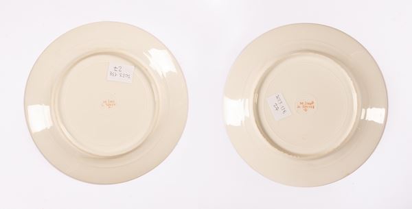 Coppia di piatti in porcellana con decori in oro di gusto secondo ottocento sulla tesa e con al cavetto dipinte scene di caccia. Sevres, fine [..]