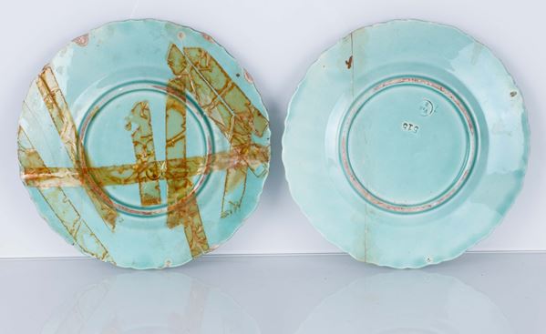 Coppia piattini verde acqua con decoro fiorato a "barbotine"