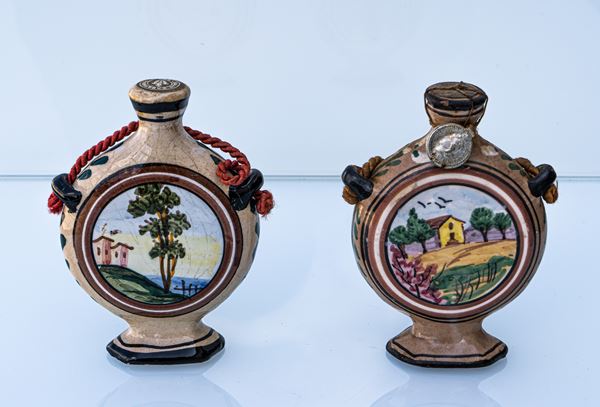 Lotto di due piccole fiasche da pellegrino contenenti Liquore Corfinio Giulio Berattucci.