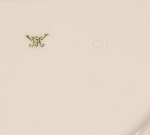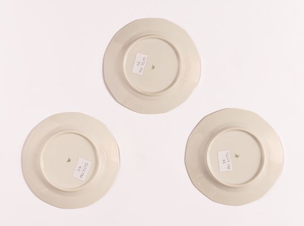 Lotto di tre piattini con decoro floreale nei toni del viola