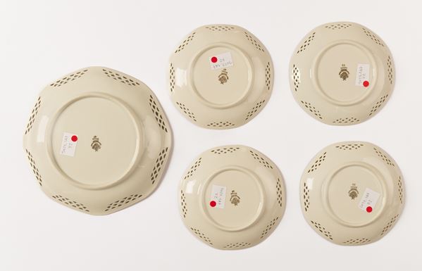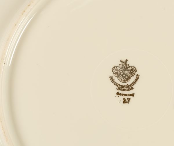 Lotto di un piatto piano e quattro piattini decorati a fiori ed intagliati nella tesa, marcati Schavarzen Hammer Germany