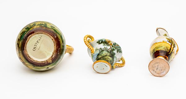 Set di tre maioliche manifattura composto da una piccola anfora, una zuccheriera ed una brocchetta