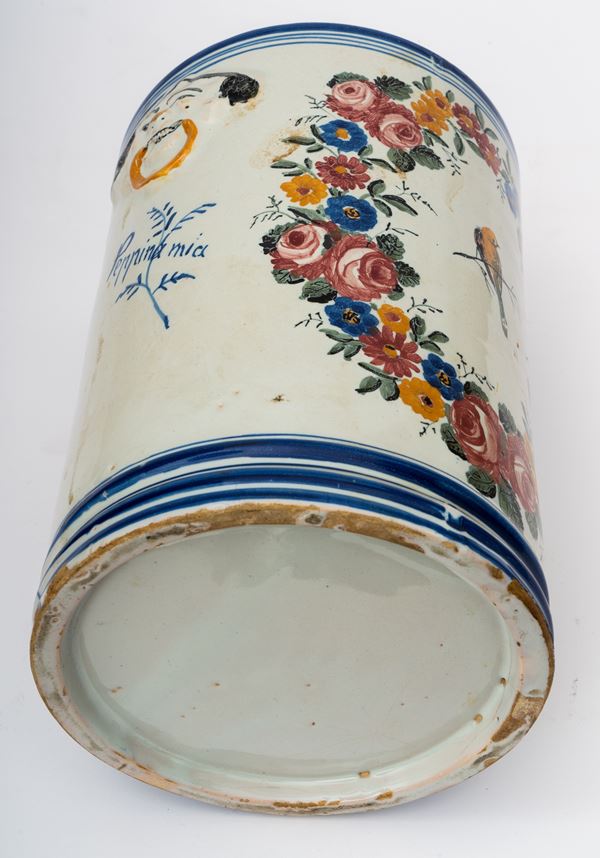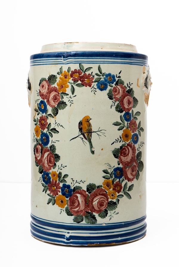 Grande vaso portastrutto senza coperchio con al fronte decoro di uccellino su ramo racchiuso in una ghirlanda floreale e al retro serto fiori [..]