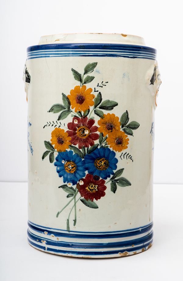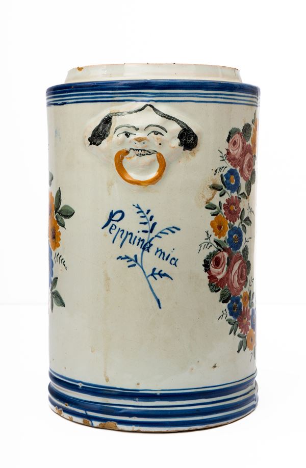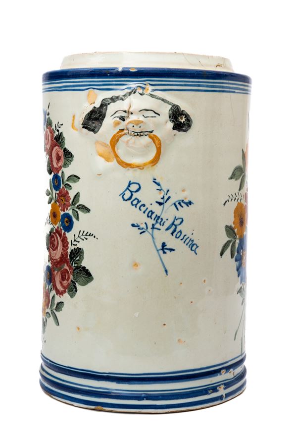 cm 28x13,5; diametro orlo cm 16,3Ai lati, sotto due prese a mascheroni (uno di questi dipinto nel gesto di fare l'occhiolino), le scritte su fiori d'acacia stilizzati "PEPPINA MIA" e " BACIAMI ROSINA"