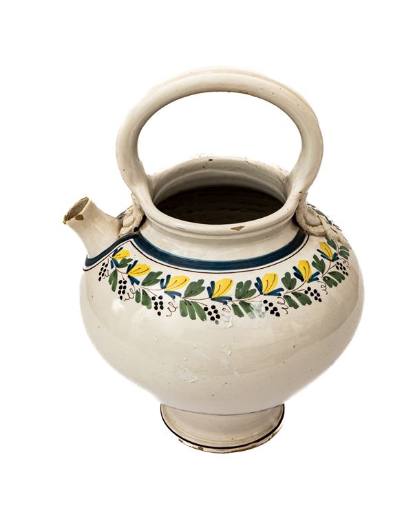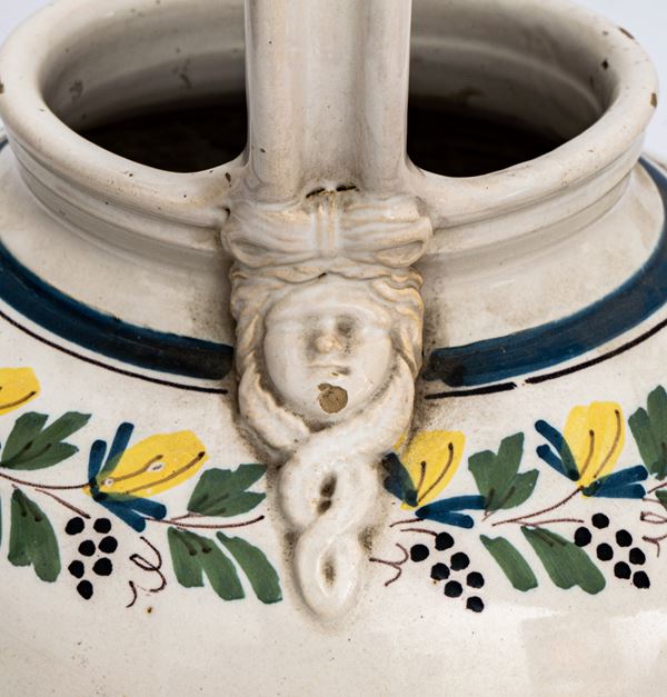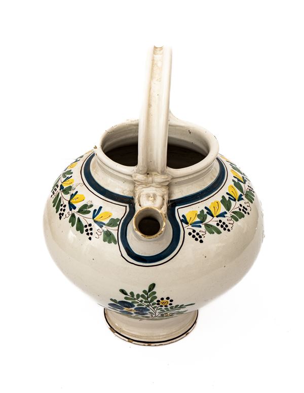 Orciolo con manico con decoro a mascherone e motivi floreali