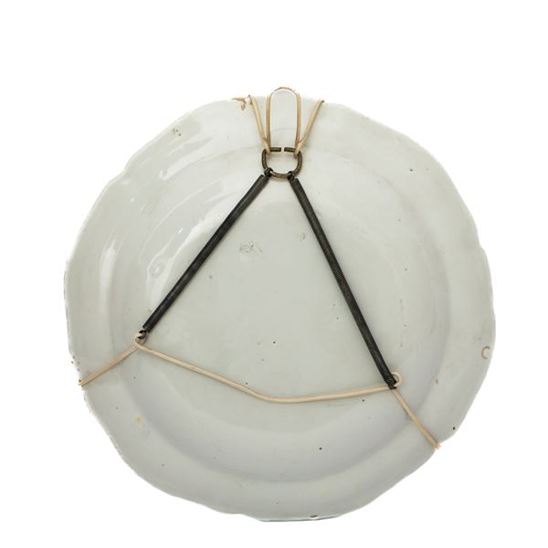 Piatto in maiolica con bordo mistilineo decorato alla tesa con tre composizioni di fiori e frutti e al cavetto con uccello stante su un serto [..]