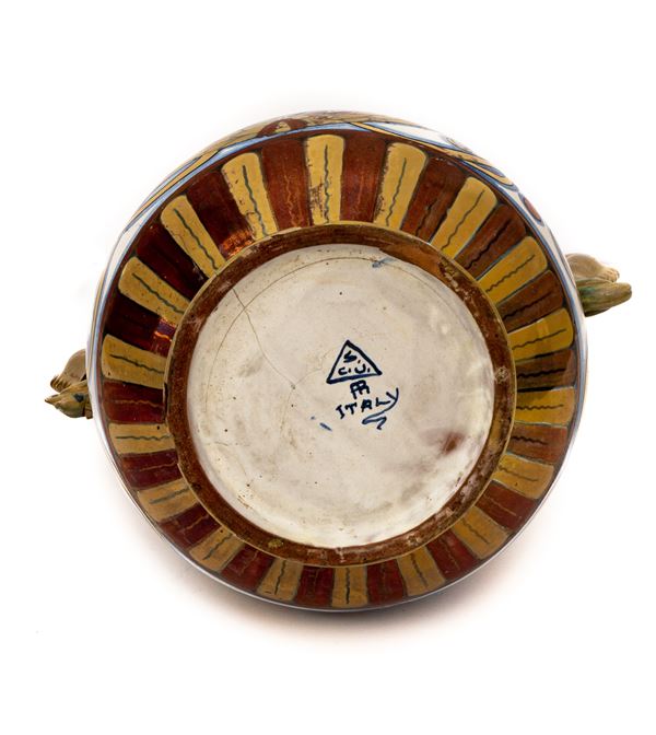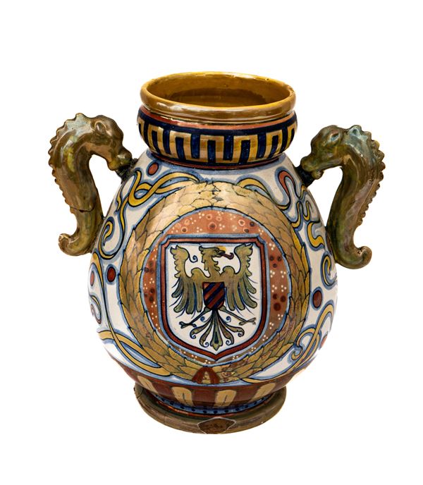 Vaso biansato realizzato da Paolo Rubboli a lustro con manici ad animali fantastici e aquila imperiale in blasone