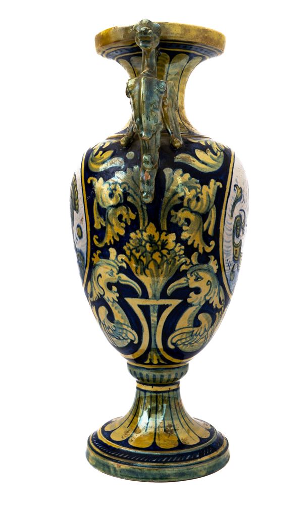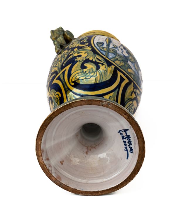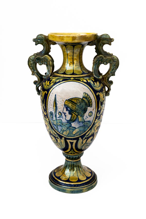 Centrotavola decorato a lustro metallico biansato con anse draghiformi, coppia di medaglioni - al fronte e al retro - centrati dai ritratti [..]