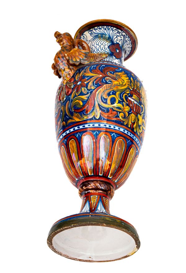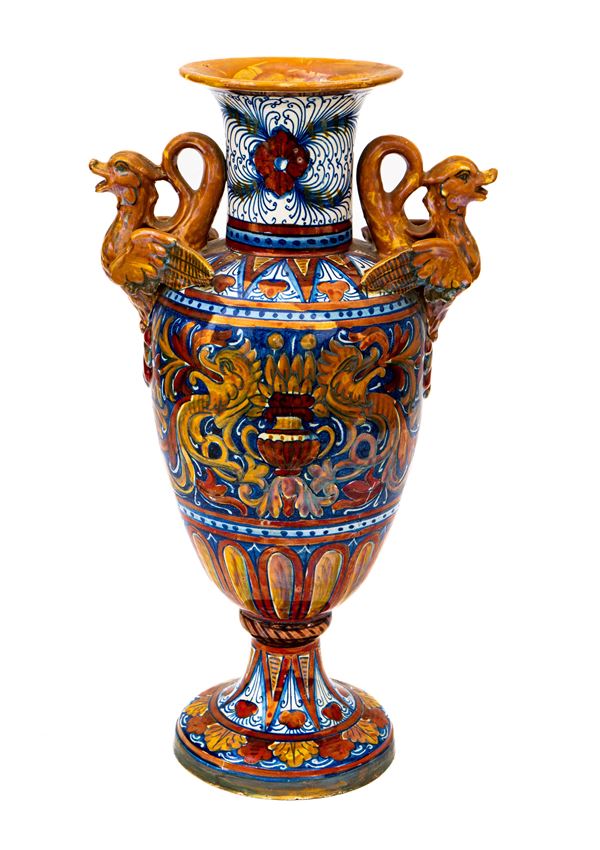 Anfora biansata in maiolia decorata a lustro metallico con anse a foggia di draghi alati. Al fronte e al retro anfora tra due animali fantast [..]