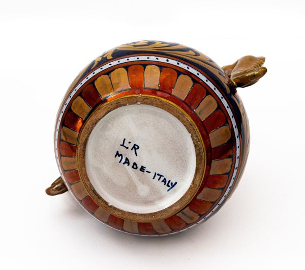 Vaso biansato in maiolica decorta a lustro metallico realizzata da Lorenzo Rubboli con manici a foggia di delfini