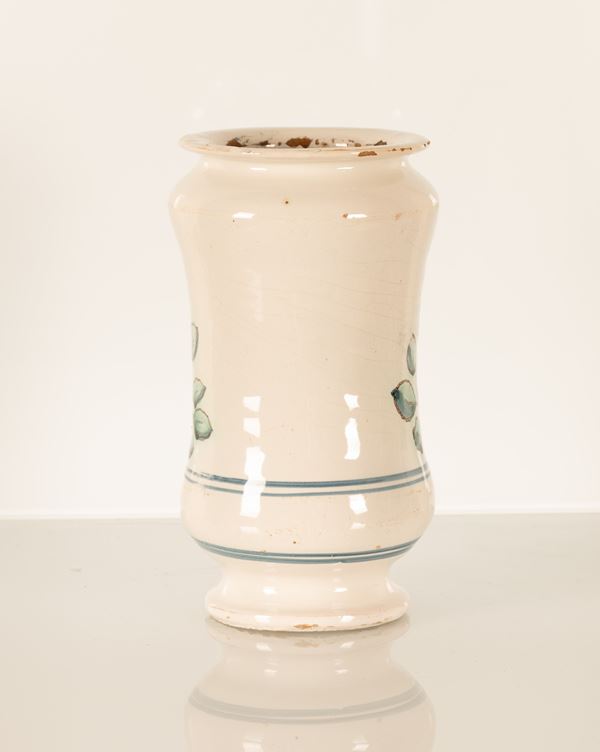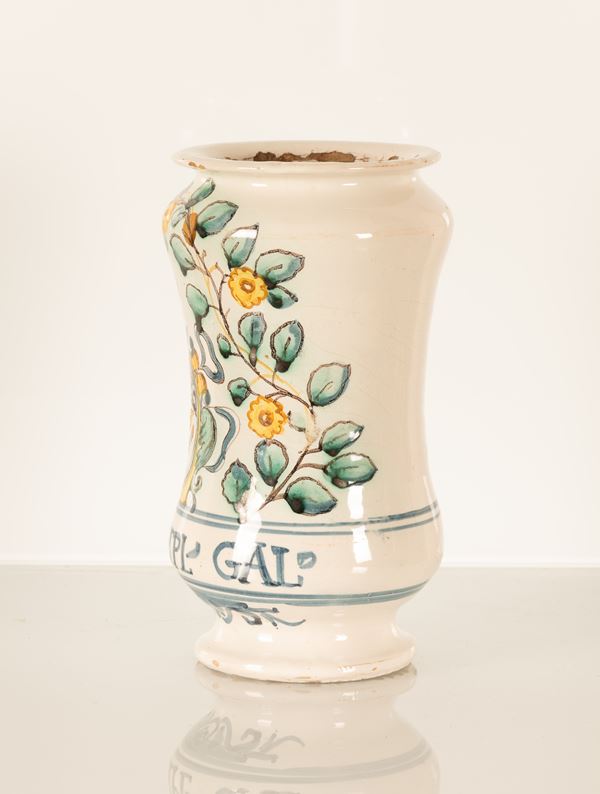 Manifattura di Torre dei Passeri, fine XVII secolo - primi decenni del XVIII secolo. Albarello da farmacia con stemma dell'inquisizione dell'ordine [..]