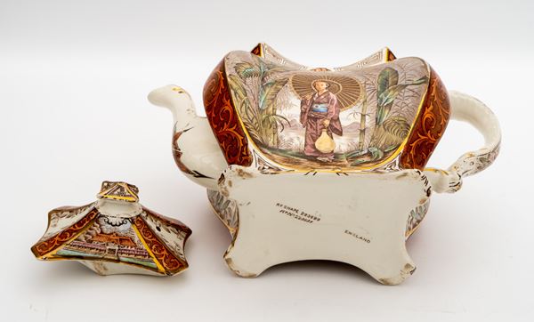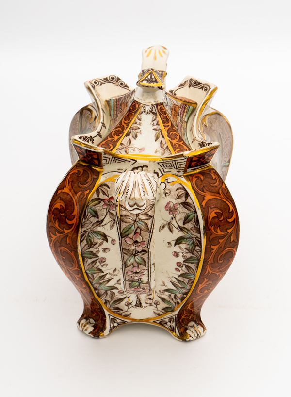 Teiera a bordi mistilinei in policromia e lumeggiata in oro poggiante su quattro piedi, manico a nastro riccamente decorato a rilievo e dipinto [..]