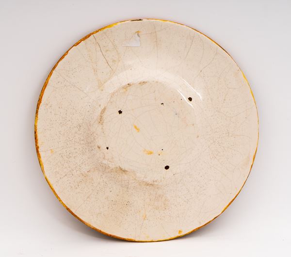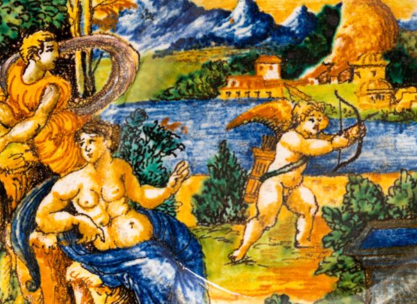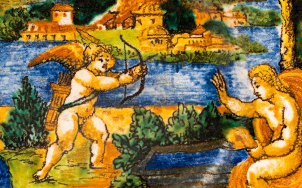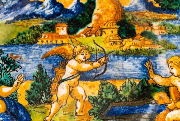 Piattino istoriato con scena allegorica alla maniera delle manifatture metaurensi della metà del XVI secolo, in particolare della bottega di [..]