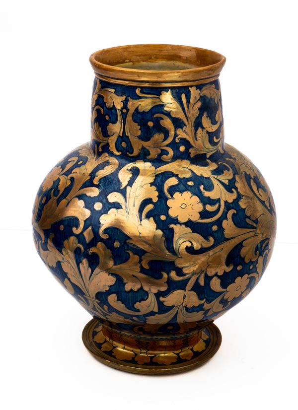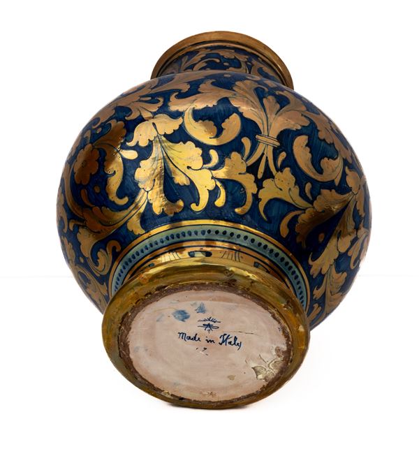 Vaso a boccia in maiolica a lustro metallico con cornucopia e riche girali fogliati in oro di gusto neorinascimentale su fondo a blu cammeo