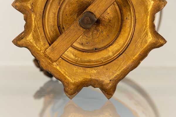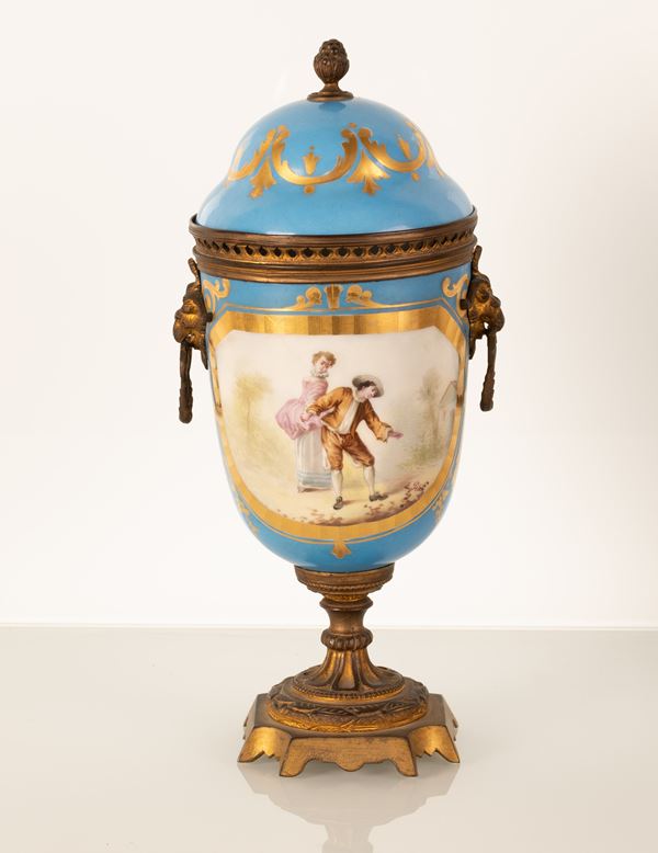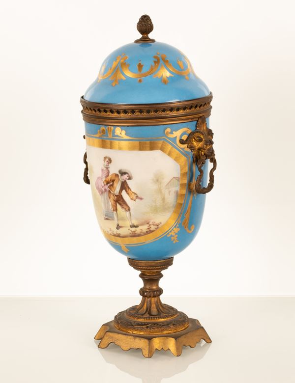 altezza cm 28,5; Ø dell'orlo cm 11Nella riserva dorata scena galante firmata "Petit" in basso a destra.