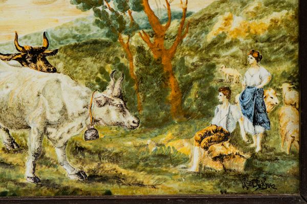 Mattonella maiolicata raffigurante armenti e greggi al pascolo