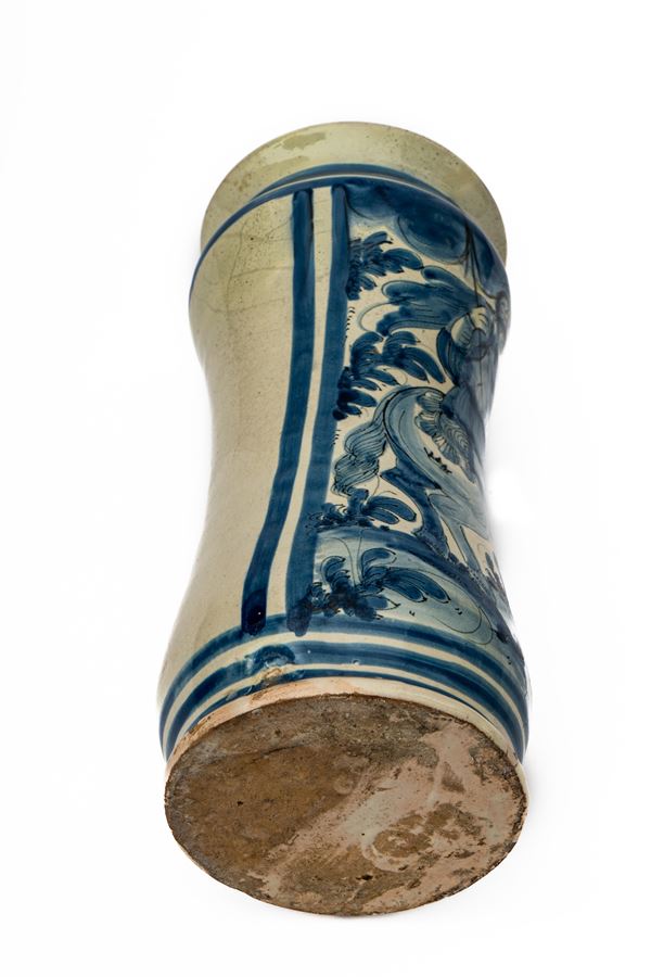 altezza 24 cm., diametro base 10 cm, diametro orlo 11 cm. L’albarello ha forma esile e poco rastremata al centro. Nella campitura è raffigurato San Giorgio a cavallo che sconfigge il drago. Eseguito su smalto stannifero di ottima qualità, è dipinto a zaffera predominante, con le figure delineate da sottili tratti di manganese. Tipica produzione savonese replicata in molti centri, da Albisola a Napoli, che emulavano gli azulejos spagnoli e portoghesi.