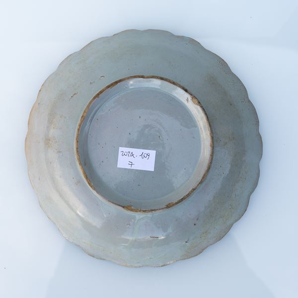 Bacile in smalto berrettino con decoro a spugnetta nella tesa e a fioraccio nel cavetto. Castelli, ultima decade del XIX secolo