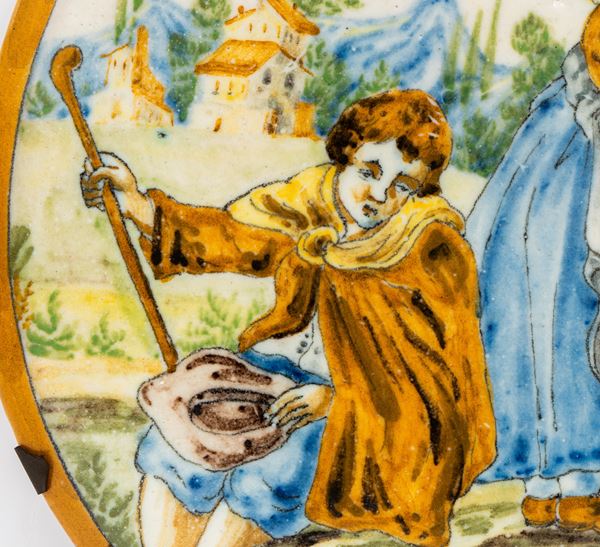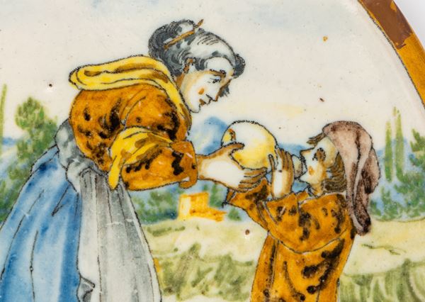 Tondo in maiolica con famiglia di pastori e bambino che beve da una bottiglia aiutato dalla madre