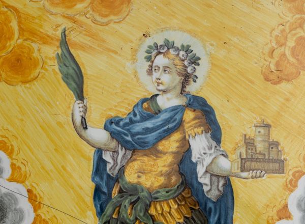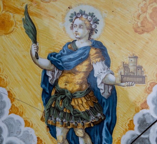 Mattonella maiolicata raffigurante San Simplicio su una nuvola stante a reggere nella mano sinistra la palma del martirio e in quella destra [..]