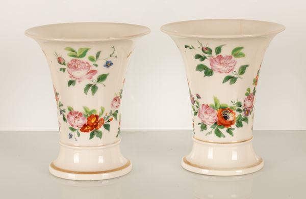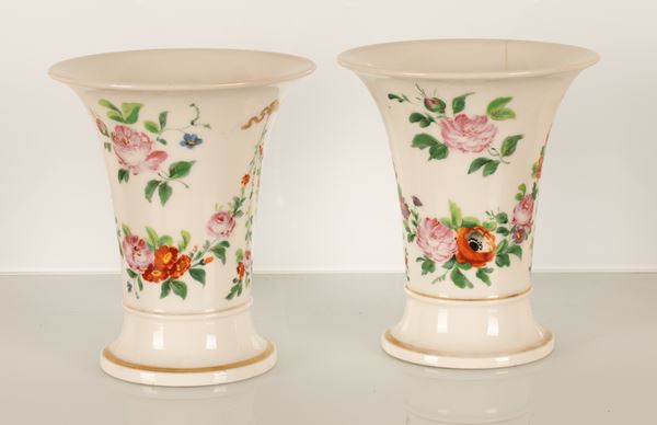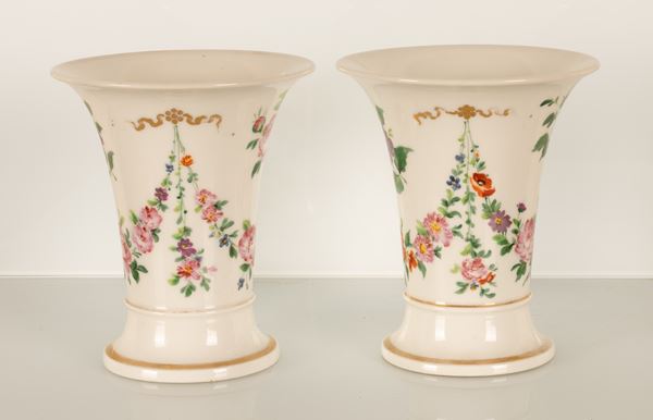 Coppia di piccoli vasi a campanula con decoro floreale. Manifattura del XIX secolo.