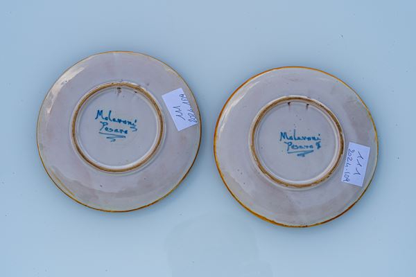 Coppia di piattini Art Nouveau con figure muliebri in serti di fiori e insetti.