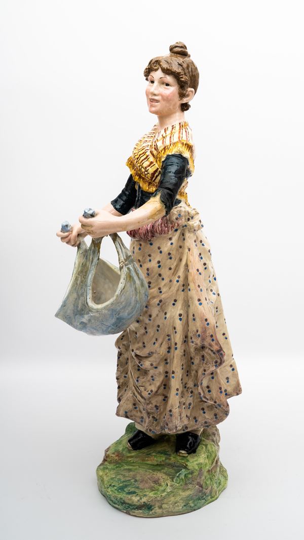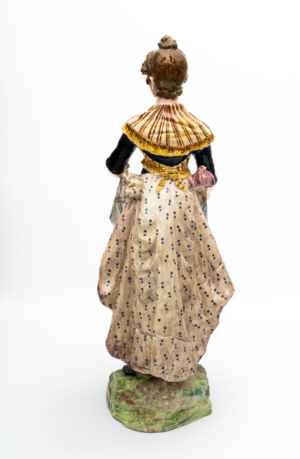 Grande statua in maiolica policroma raffigurante giovane donna in abiti tradizionali