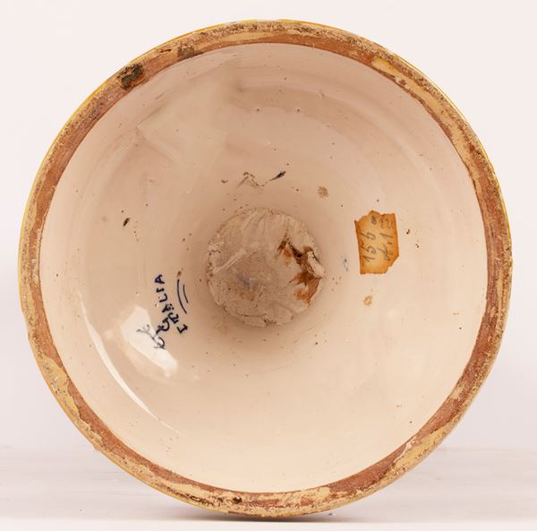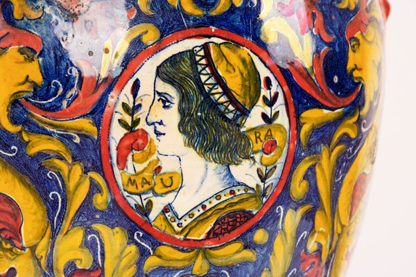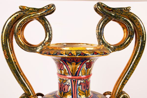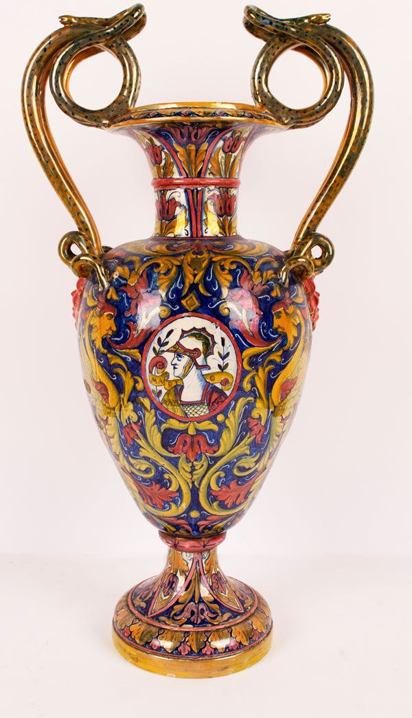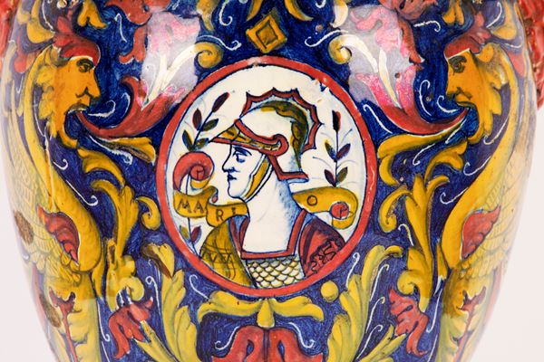 Ø base cm 17; Ø collo cm 13; cm 64,5x33Anse serpentiformi a volute, decoro neorinascimentale con due medaglioni tondi centrati su fondo bianco: in uno figura di condottiero romano, nell'altra profilo muliebre tra la scritte in caratteri capitali "MAURA" ripartita in un decoro ad acacie.