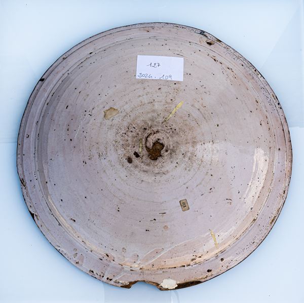 Grande piatto con decoro puntinato alternato nella tesa e fiore azzurro nel cavo tra serti fioriti e decori serpentiformi
