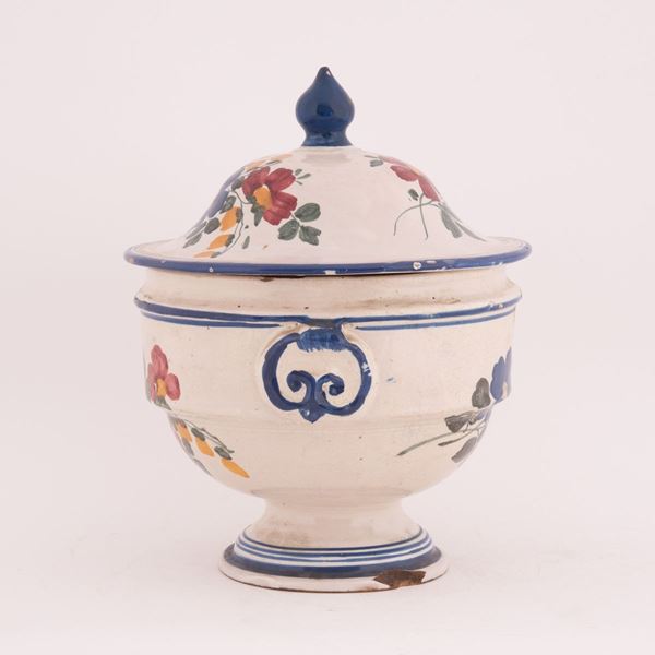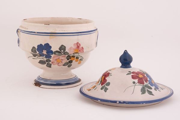 Zuppiera in maiolica decorata in policromia con motivi floreali e bordatura in blu. Ai lati maniglie incavate. Coperchio con presa in blu.