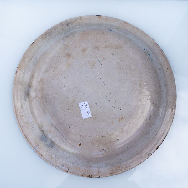 Grande piatto con decoro a stampo blu sulla tesa e a paesaggio nel cavetto