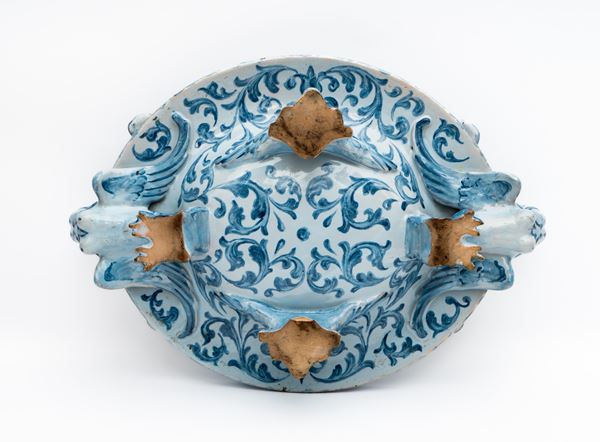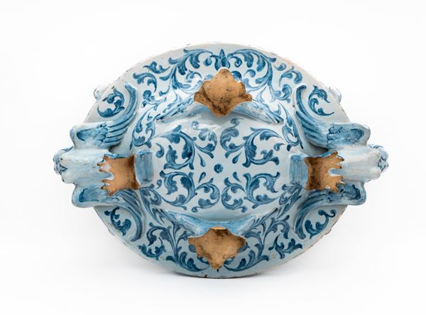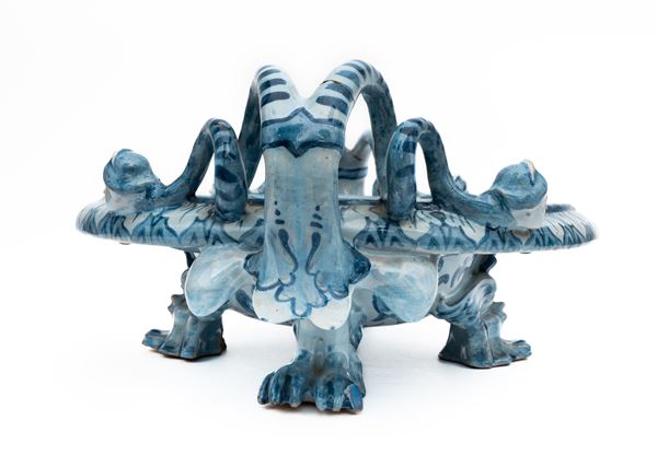 Centrotavola in maiolica nei toni dell'azzurro poggiante su quattro piedi a foggia di mascheroni urlanti, anse serpentiformi terminante con [..]