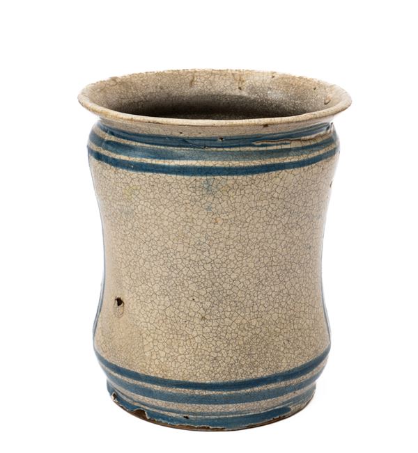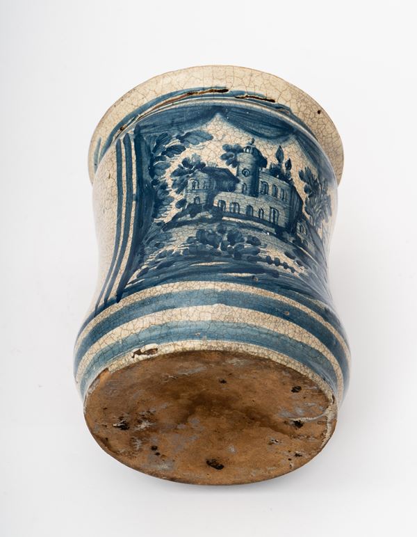 Albarello in maiolica con riserva centrale istoriata a paesaggio nei toni del blu