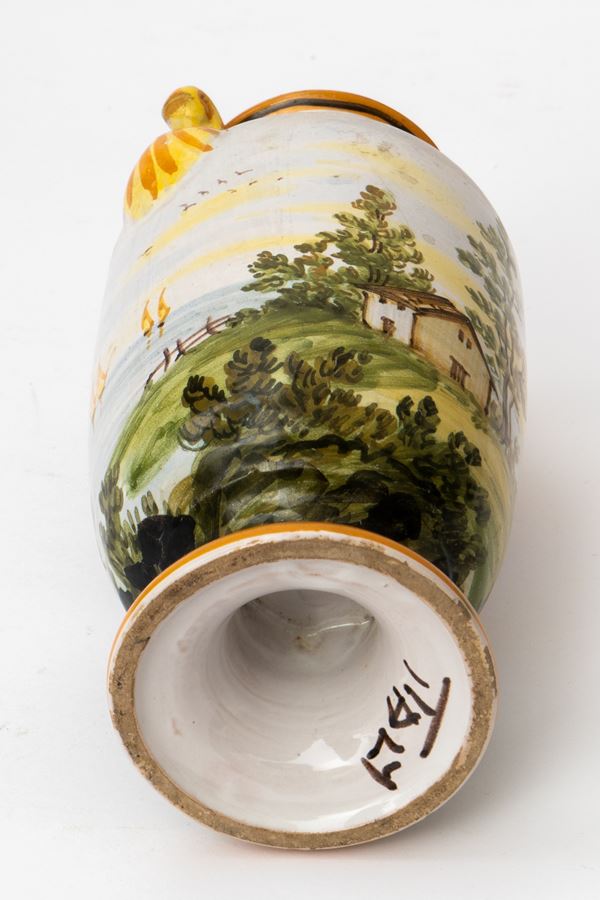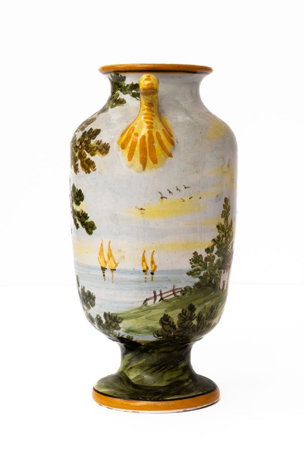 Vaso biansato con manici a ricciolo e decoro a paesaggio