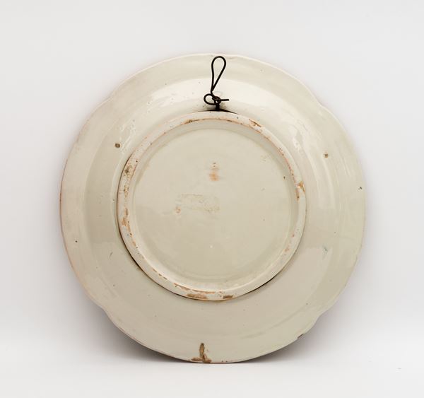 Piatto con decoro ad ornato a paese nel cavetto e a mazzetti fioriti nella tesa
