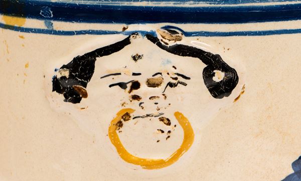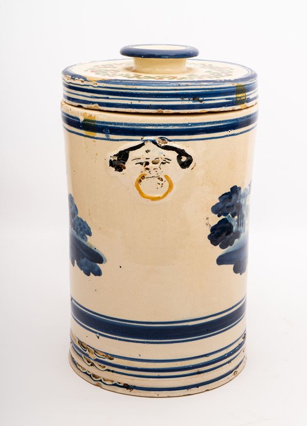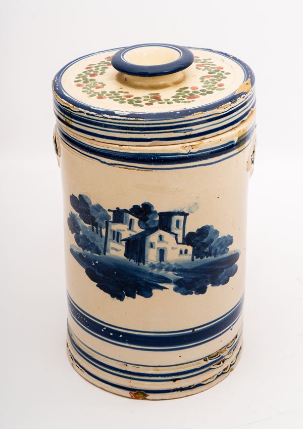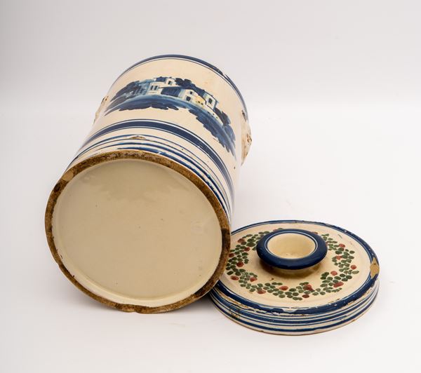 Portastrutto con decoro al fronte e al retro di case blu in paesaggio e a serto fiorito sul coperchio