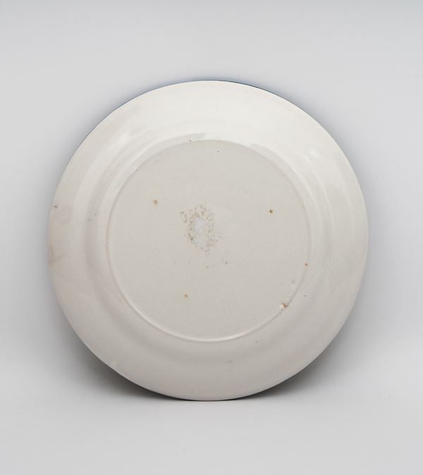 Piattino con scena pastorale nel cavetto e putti, cartigli e serti fioriti nella tesa
