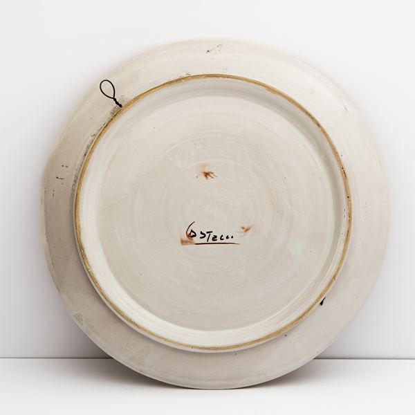 Piatto in maiolica decorato alla tesa con motivi fogliati alternati e nel cavo con ornato a paese