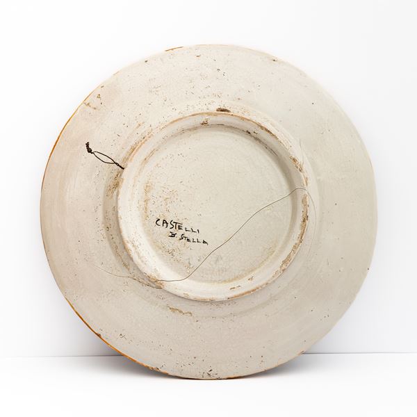 Grande piatto di Castelli. Manifattura Stella con decoro a girali fogliati sulla tesa e paesaggio agreste con donna e pecore sul greto del fi [..]