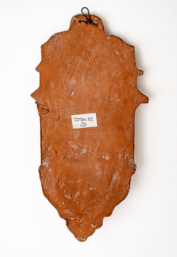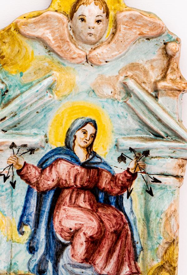 Acquasantiera con effigie della Madonna delle Grazie recante in mano delle frecce spezzate, incorniciata da motivi architettonici e la testa [..]