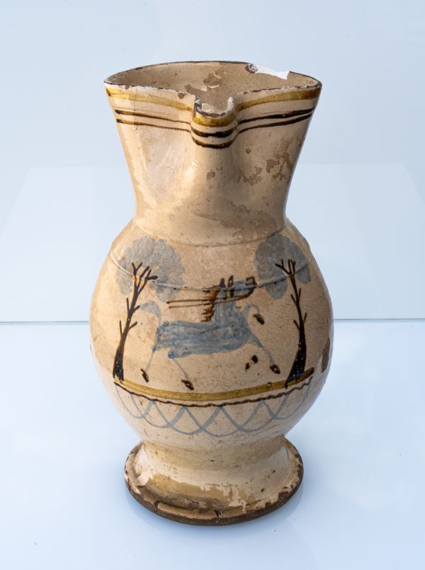 Antica brocca con decoro con cavallo tra alberi.
