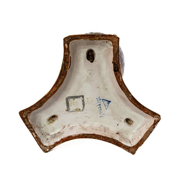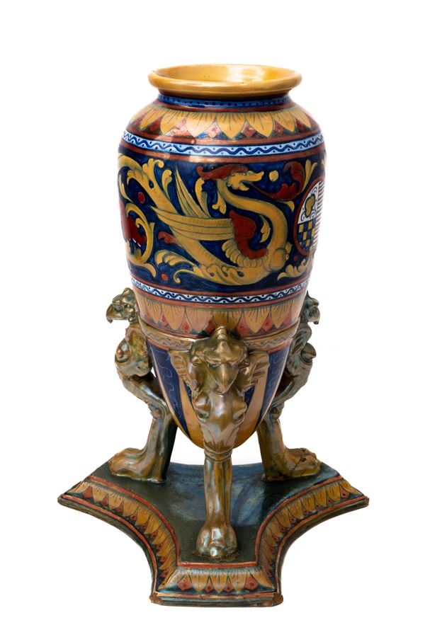 Vaso in maiolioca a lustro metallico a tripode con piedi a guisa di grifoni. Corpo ovoidale con decori a girali fogliati su fondo blu cammeo [..]