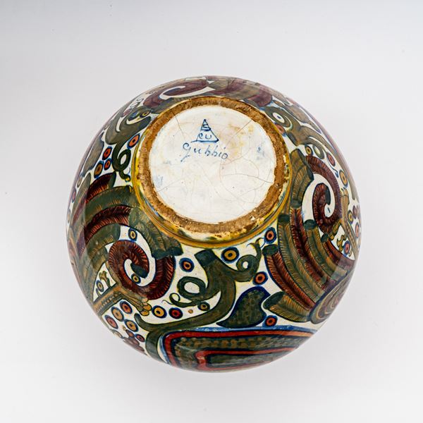 Vaso a boccia in maiolica a lustro metallico con decoro a melograni aperti e uccelli