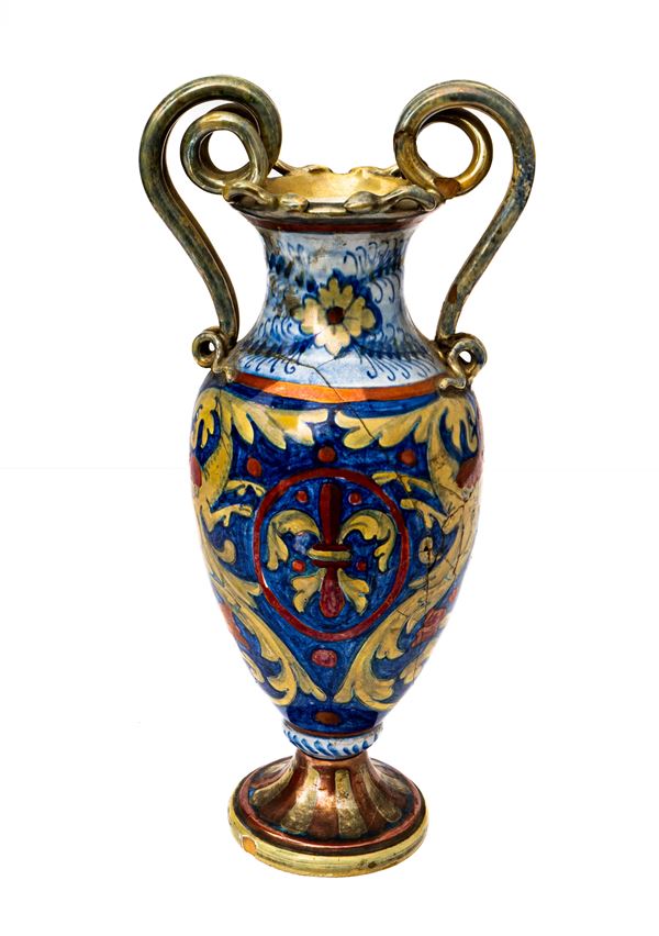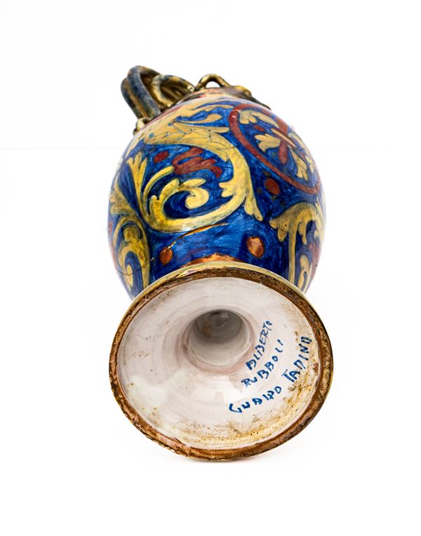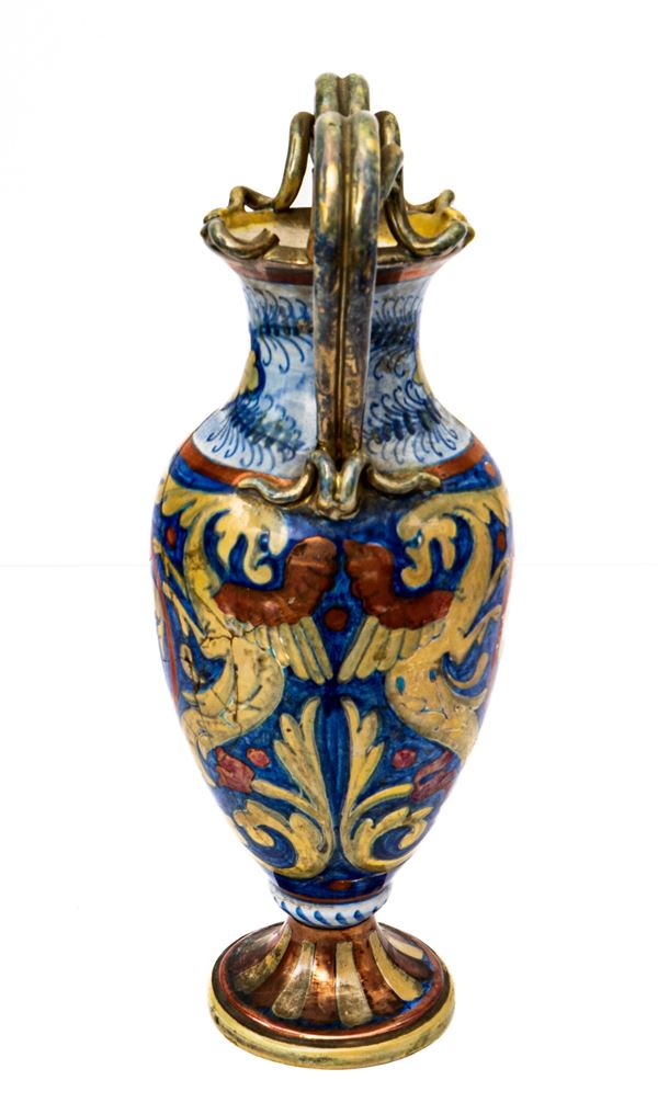 Coppia di vasi a lustro metallico di cui uno biansato ad anfora di Alberto Rubboli e l'altro piriforme con decori fogliati