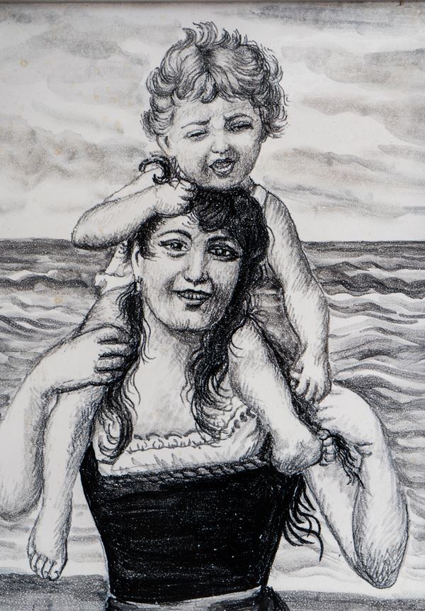 Mattonella maiolicata di Giovanni d'Angelo con bambino sulle spalle della madre in riva al mare.