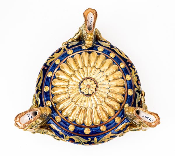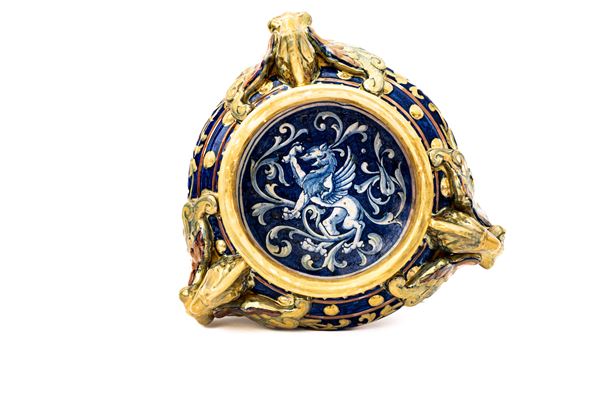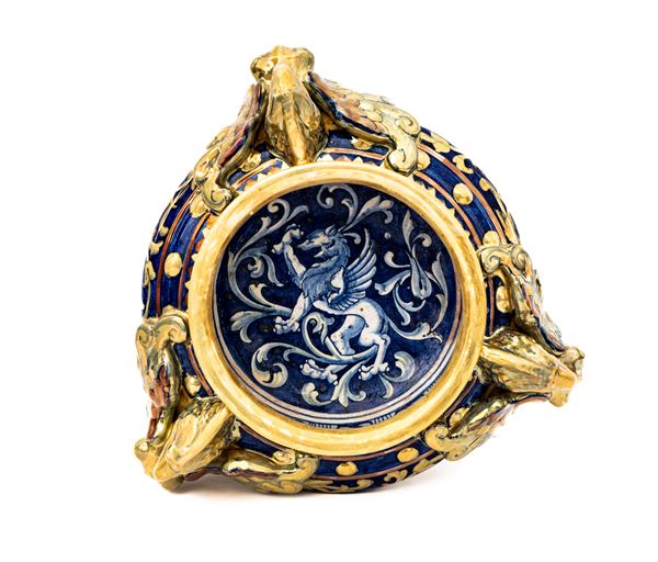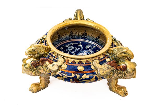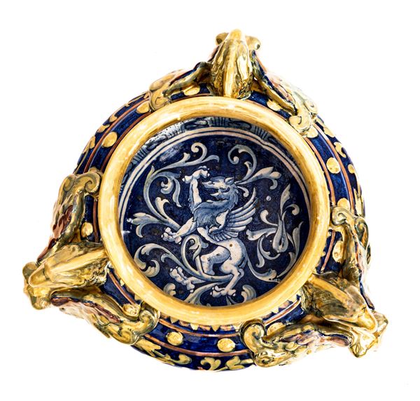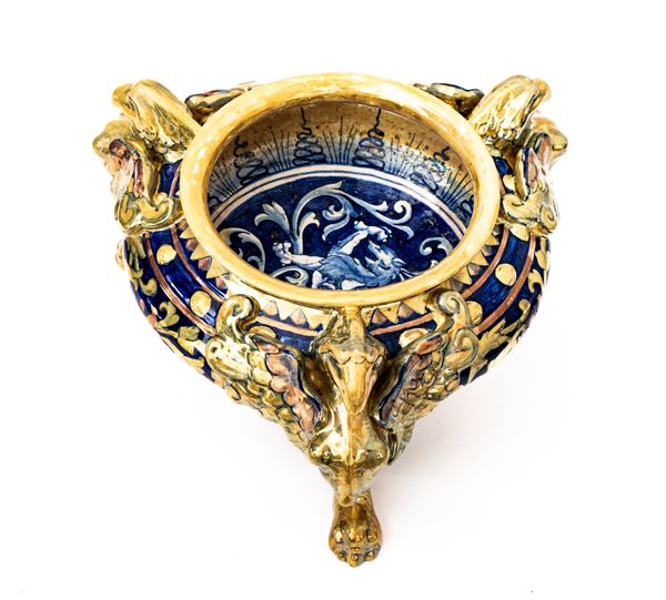 Centrotavola in maiolca decorata a lustro metallico con tre figure di grifoni stanti a sostenere una coppa con decori a girali di gusto neorinascimentale. [..]