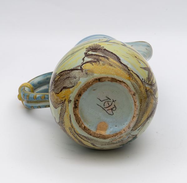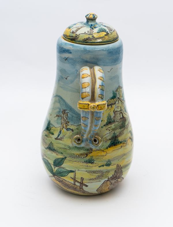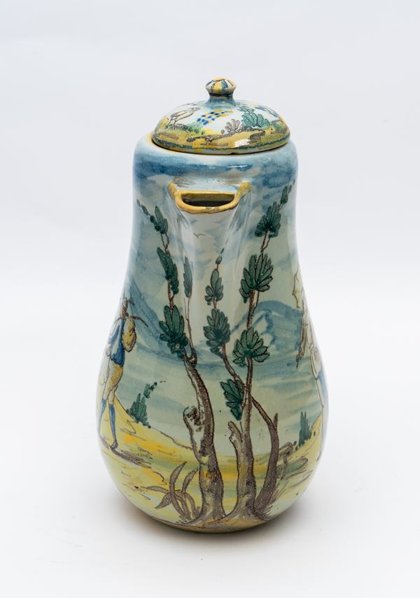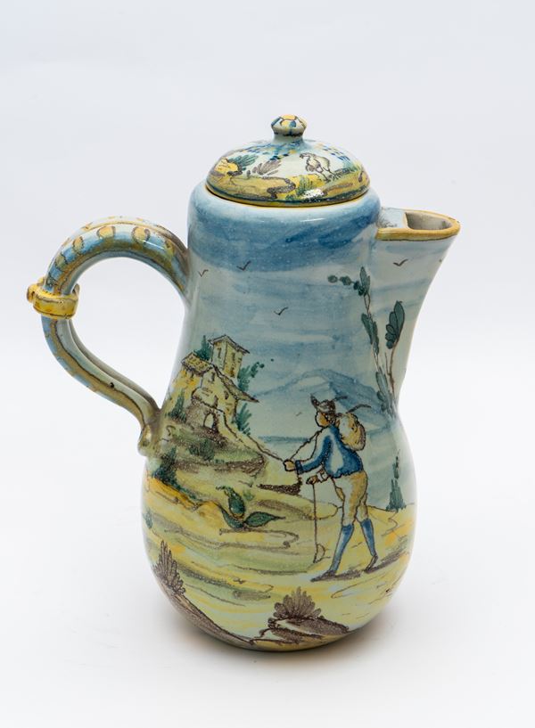 Caffettiera in maiolica decorata su tutto il corpo con figura di viandante in paesaggio e figura muliebre con un ombrellino.