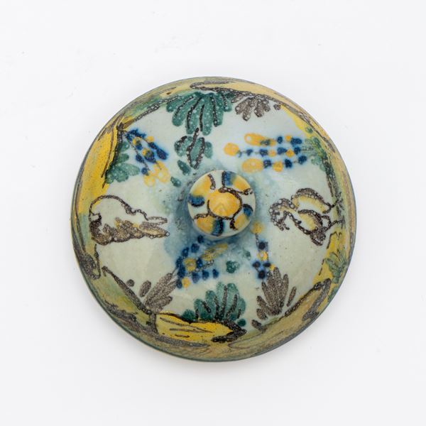 Altezza 25,5 cm Larghezza 21,5 cm.Decoro al coperchio con gallina e coniglio in ambiente campestre.