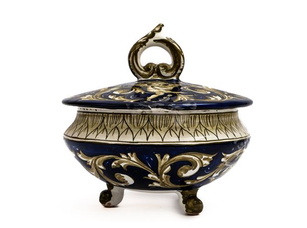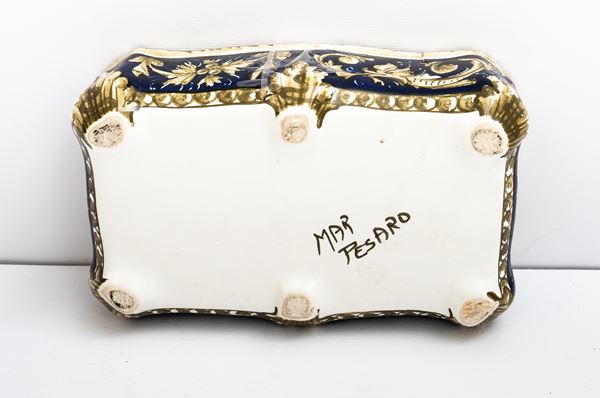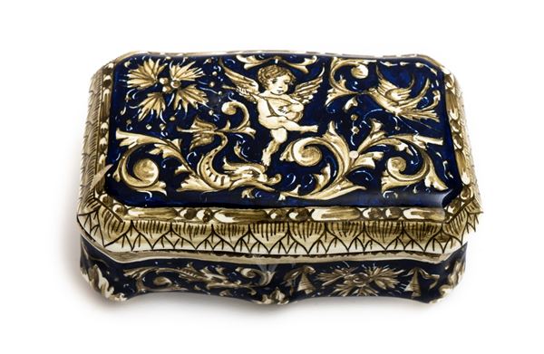 Portagioie: cm 8x18 Decoro con grottesche e istoriato sul coperchio con putto che suona la cetra