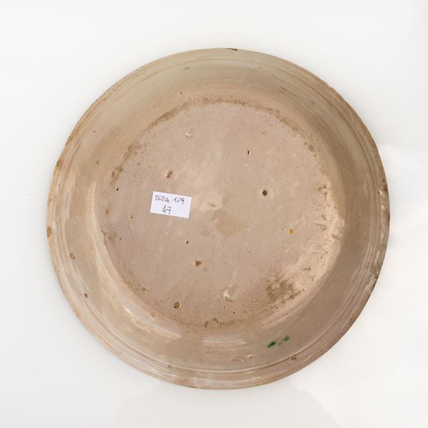 Grande piatto con decoro con colomba a spugnetta nella tesa e una colomba al centro del cavo con ramo d'ulivo